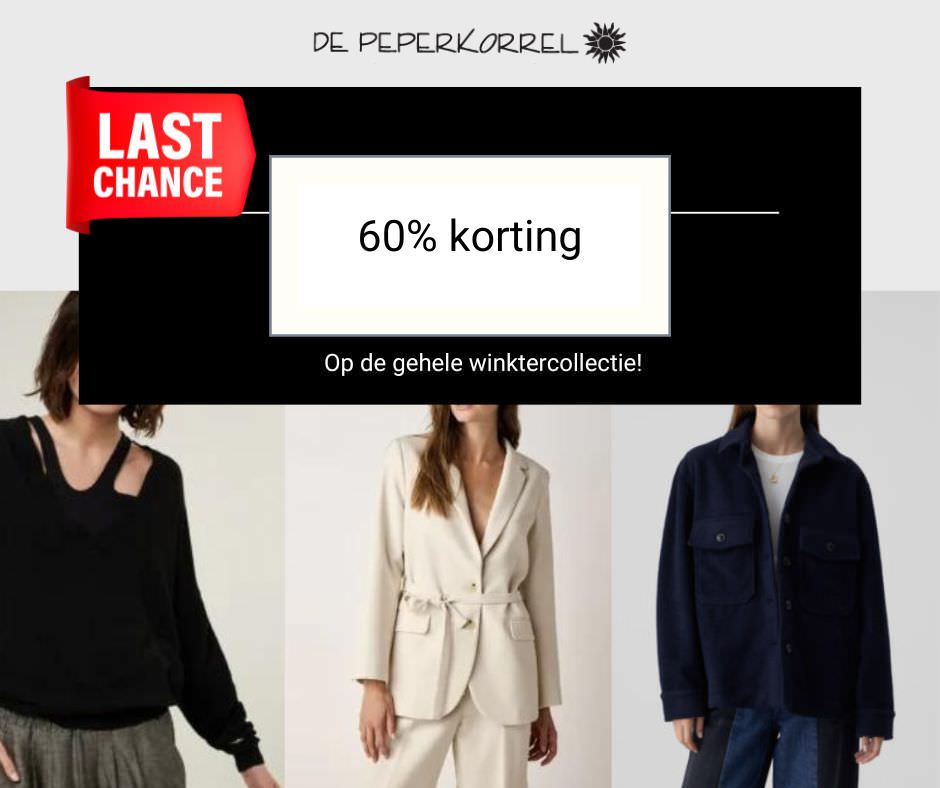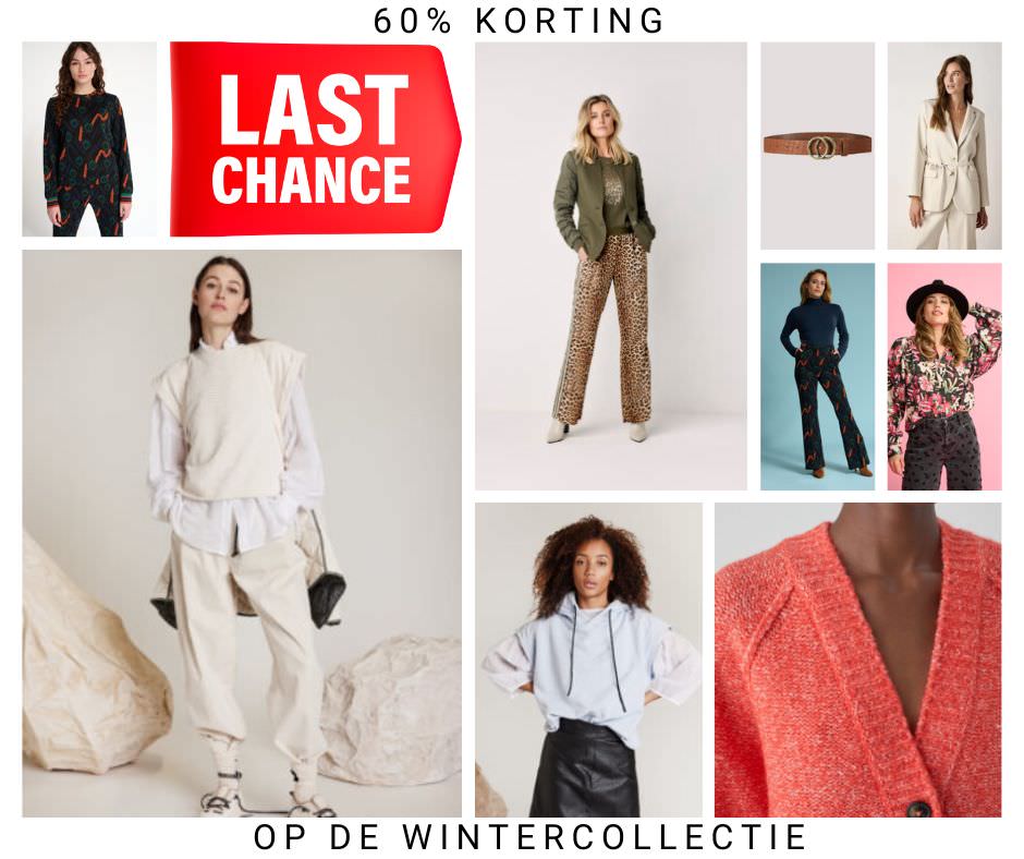 Alles van de Wintercollectie nu tegen 60% korting. Dit is de laatste kans. Volgende week meer over de nieuwe collectie.Je krijgt geen korting op de nieuwe collectie of de basiscollectie maar wel op alles van de wintercollectie.