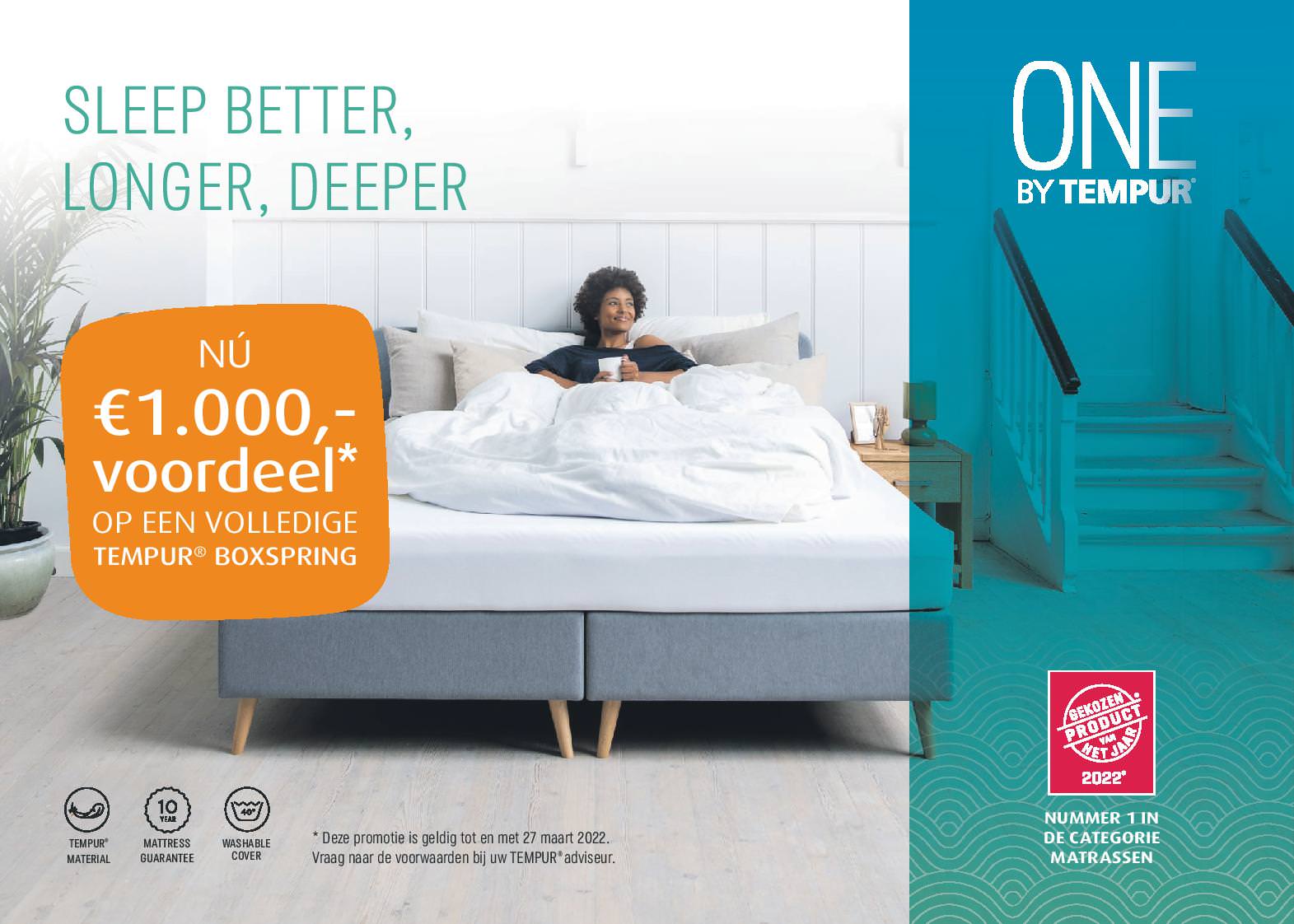 Ontvang nu € 1000,-- voordeel op aankoop van een complete ONE BY TEMPUR tweepersoons boxspring. Ongeacht het type boxspring (static of adjustable), kleur, matrasgevoel of afmeting,