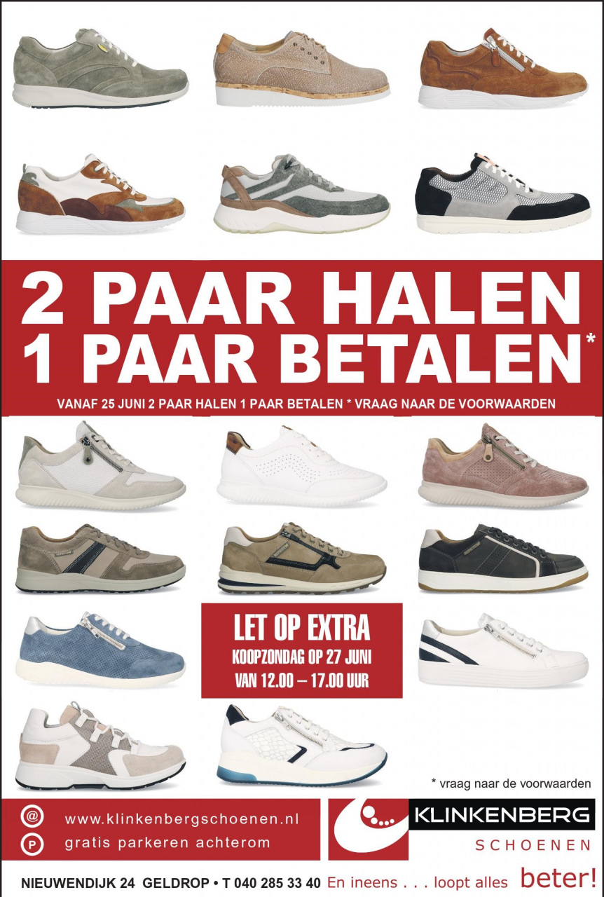 Vrijdag 25 juni starten wij weer met onze actie 2 paar halen 1 paar betalen of 30% korting per paar op heel veel geselecteerde modellen. Zondag 27 juni zijn wij extra open van 12.00 tot 17.00 uur. Wees er snel bij voor de beste keuze. De actie geldt alleen in de winkel en niet op onze webshop.
