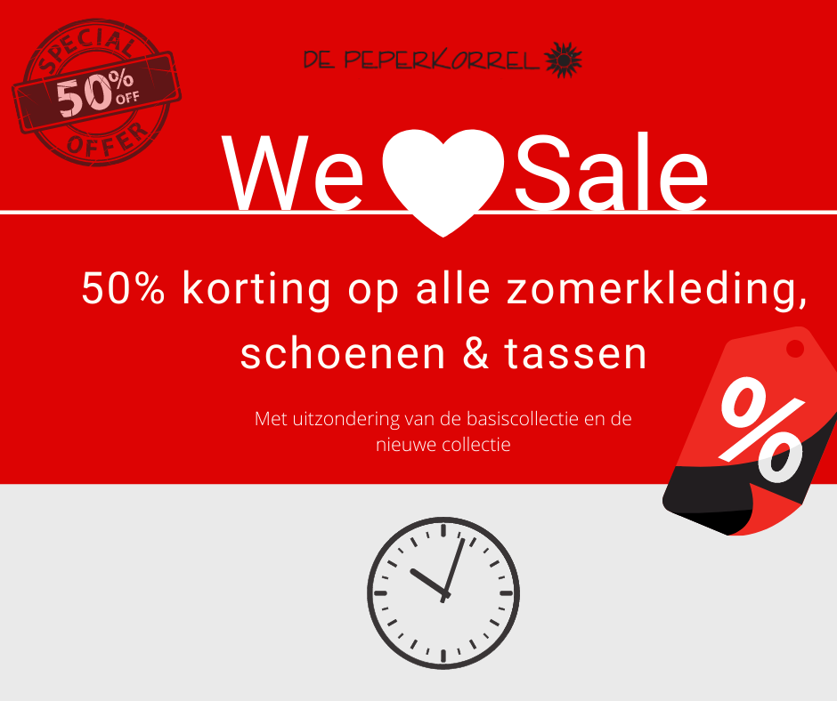De Peperkorrel geeft 50% korting op de gehele zomercollecte. Met uitzondering van de basiscollectie en de nieuwe collectie.