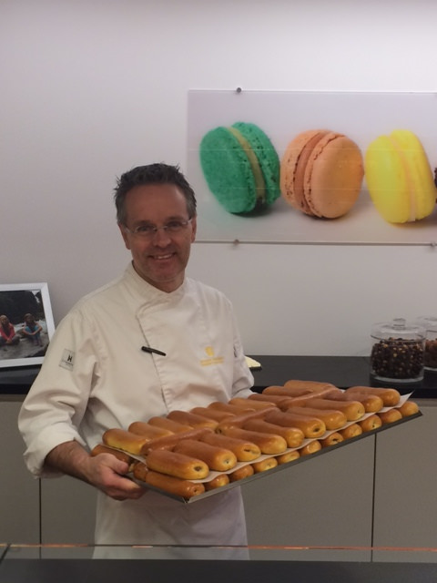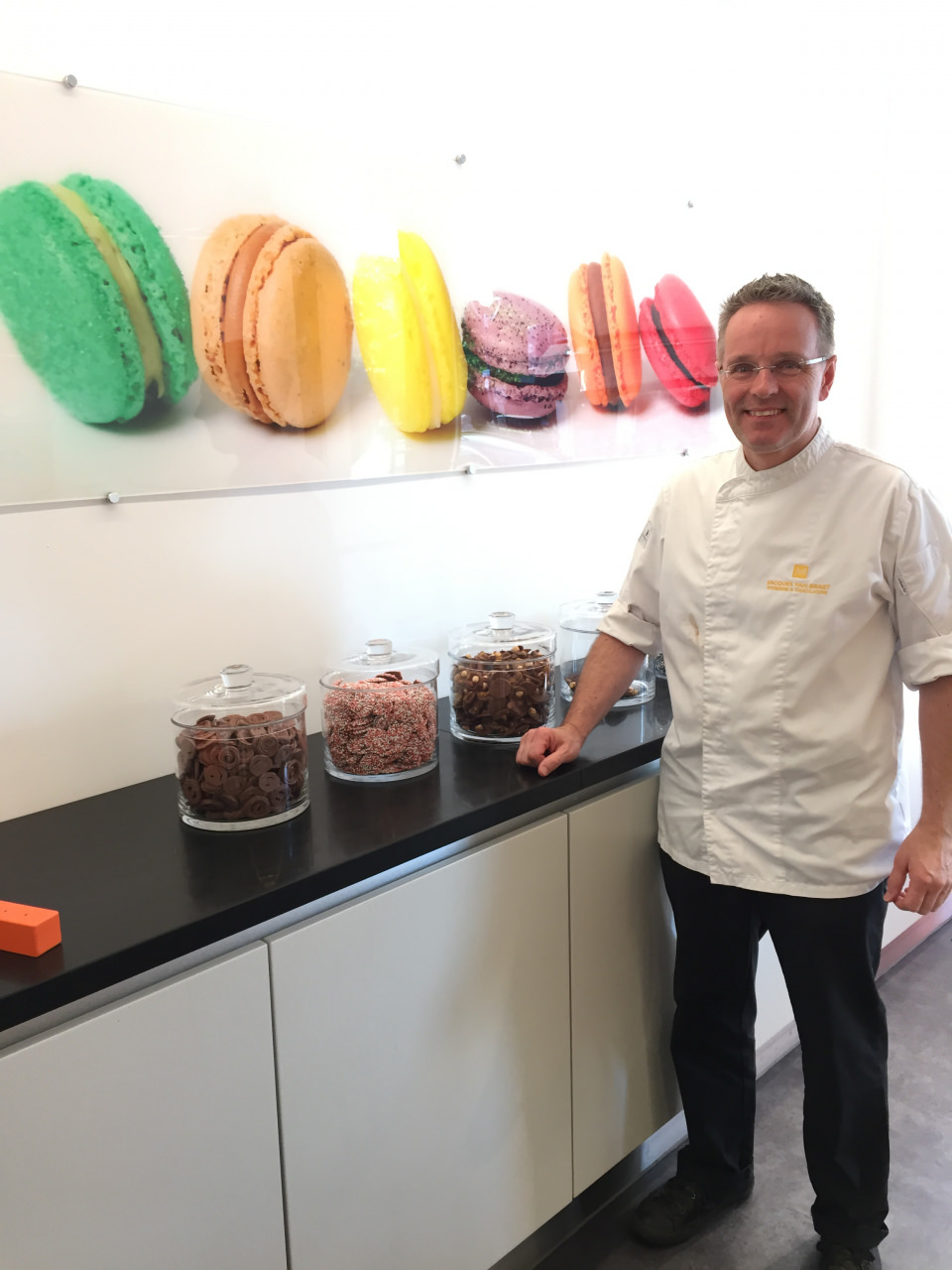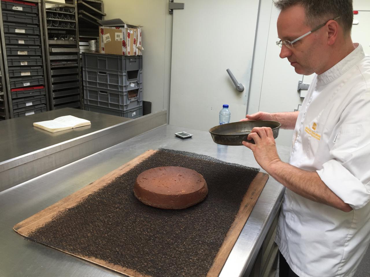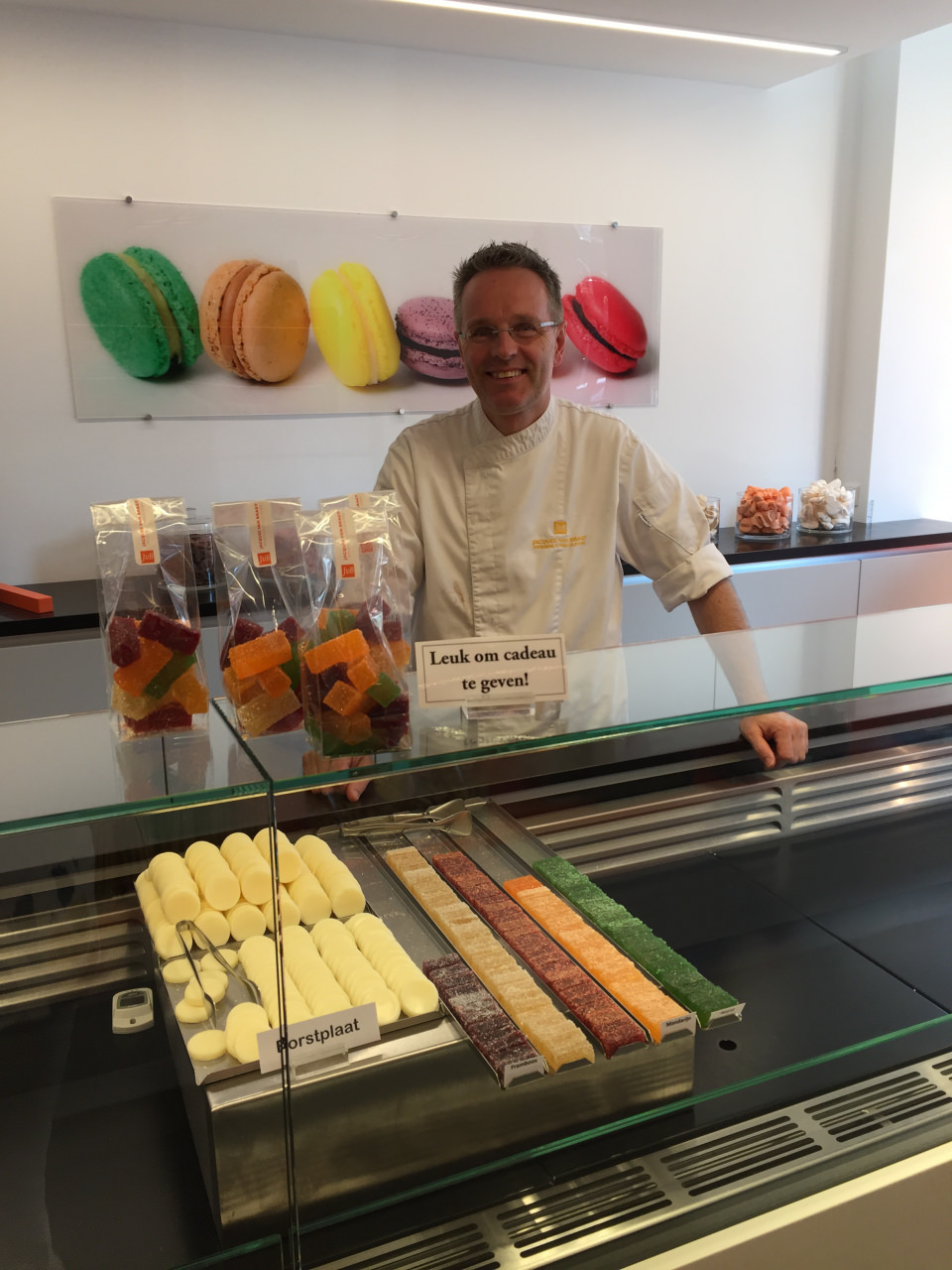 Jacques staat al op me te wachten in zijn witte jas met hier en daar een chocoladevlek. Hij biedt me een stoel aan in zijn kantoor. We zijn nog maar net in gesprek en er begint iets te piepen. Er moet een taart worden omgedraaid. Hij vertelt dat hij een nieuw recept heeft uitgeprobeerd. “Morgenochtend wordt deze taart aangesneden en gaan we proeven of het de winkel in kan.”