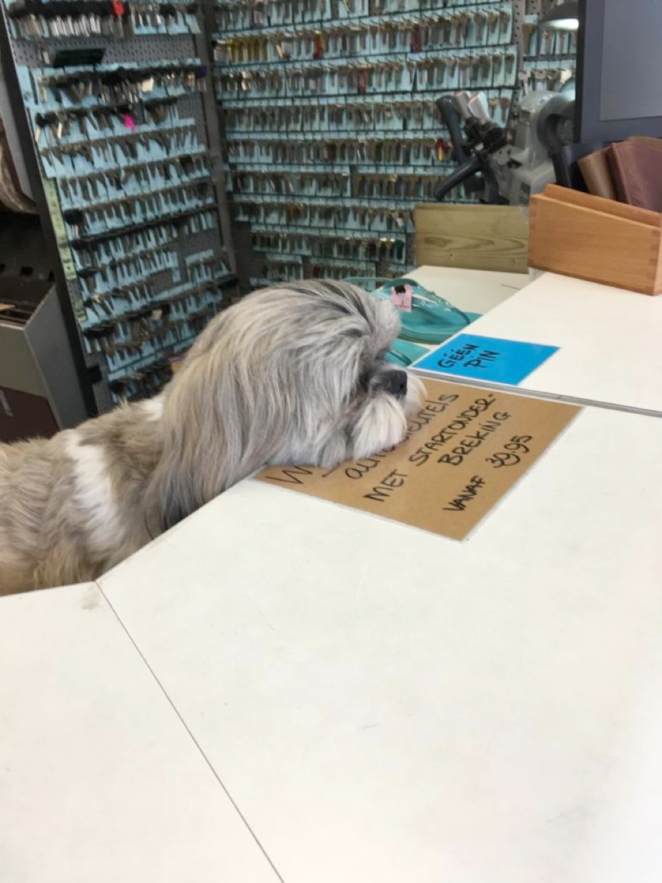 Op de toonbank/werkbank ligt hun hond. Zo grappig om te zien. Het beestje kijkt me vriendelijk aan als ik hem aai. En wat er ook gebeurt, hij verroert zich niet. Hij draait zich nog eens om en nestelt zich in het dekentje.