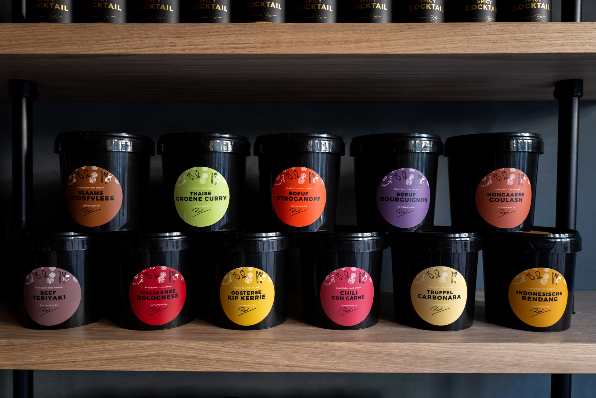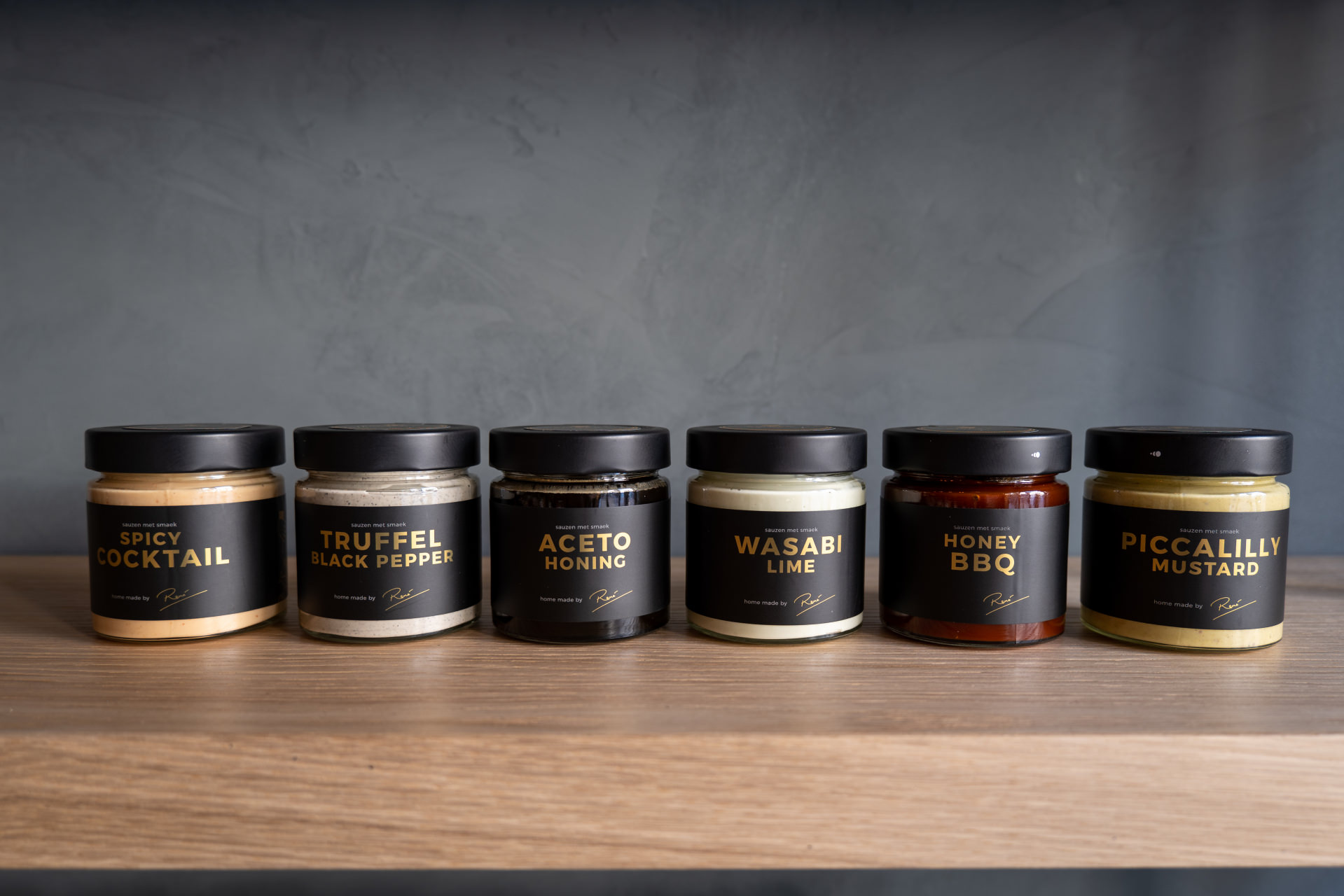 Op de planken aan de wand zie ik allemaal producten staan. Dit zijn producten onder eigen label. Denk aan:- Sauzen