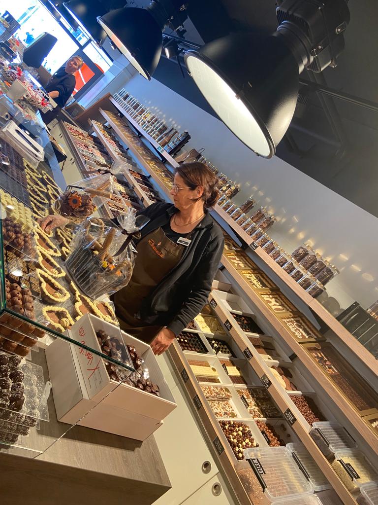 Volgens Inge en Peggy is het ‘keigezellig’ in de winkel. Ik praat met hen terwijl ze blijven werken aan de mooiste chocoladecadeautjes. De klanten die binnenkomen worden hartelijk verwelkomt en goed geholpen. Ze denken mee met de klant en willen iedereen zo goed mogelijk helpen. Inge heeft jaren bij Bart Smit in Geldrop Centrum gewerkt en lijkt half Geldrop te kennen. Ze zegt zelf dat ze de hele dag kan groeten als ze dichter bij de deur zou werken.Peggy lacht en zegt dat ze niet voor niets achter in de winkel haar werkplek heeft. Inge dacht dat ze nooit meer zo’n leuke baan kon krijgen, maar dat blijkt niet waar. “Het is echt een feest om te werken bij Rousseau.“