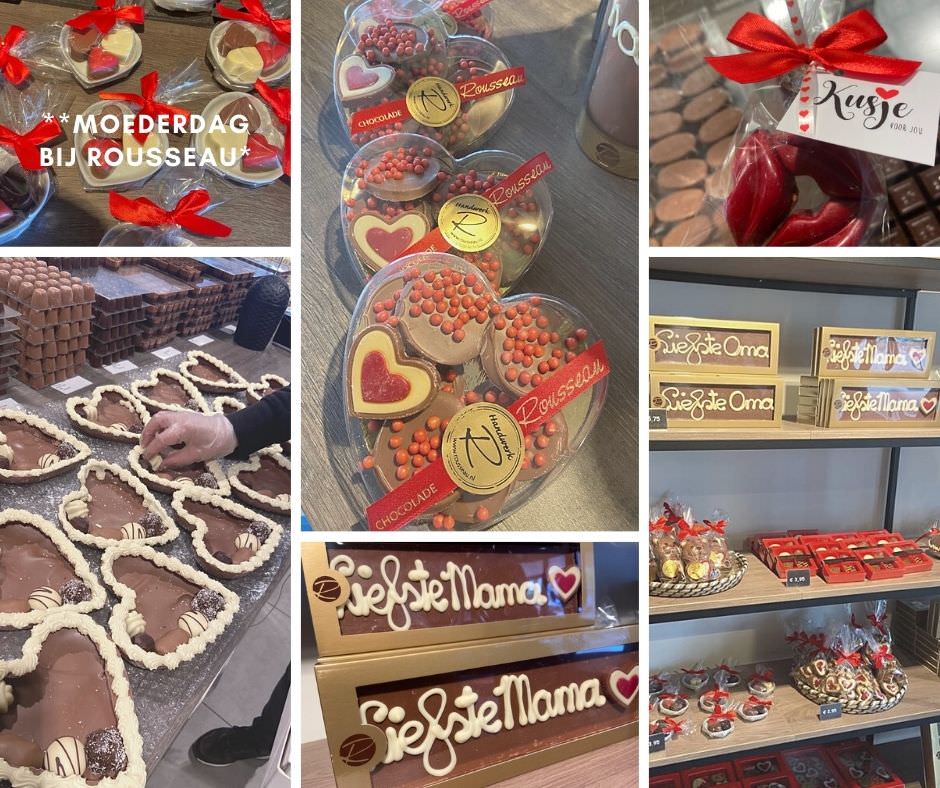 De winkel ligt vol met chocoladeverrassingen voor elke portemonnee. Kies voor dé specialiteit van Rousseau, de pindarotsjes, of laat een wensplaat op maat maken. Verras je moeder met chocolade, dan zit je altijd goed!Loop eens binnen bij de mooie en gezellige winkel van Rousseau aan de Heuvel. Voor de deur ligt een groot parkeerplein. Een bezoek aan Rousseau is prima te combineren met het halen van de boodschappen voor het speciale Moederdag ontbijt.