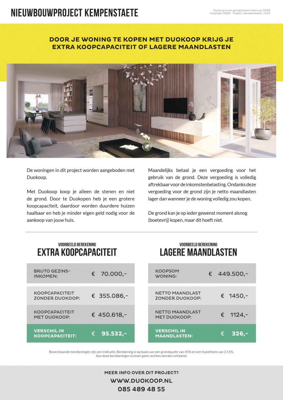 Misschien loopt u met de gedachte om in een fraai nieuwbouwappartement in Kempenstaete te wonen, maar wilt u niet al uw centen in de stenen stoppen. In dat geval biedt Duokoop een uitkomst!