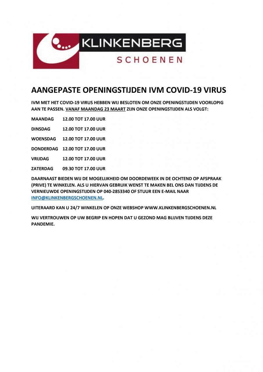 Binnen de gegeven restricties willen wij jullie van dienst blijven zolang dit kan. Dat kan het veiligst door online te kopen maar als je met ons je aan de tips houdt van her RIVM dan kunnen we jullie voorlopig ook nog in onze winkel helpen. We hebben echter wel onze openingstijden aangepast. Nu zijn we MAANDAG T/M VRIJDAG dagelijks van 12 tot 17 uur open en op ZATERDAG van 9.30 tot 17.00 uur open. De ochtenden doordeweek reserveren we voor klanten die (prive) willen winkelen. Dit kan daardoor ook alleen op afspraak. Bel tijdens de aangepaste openingstijden naar de winkel: 0402853340 of stuur een e-mail naar info@klinkenbergschoenen.nl.